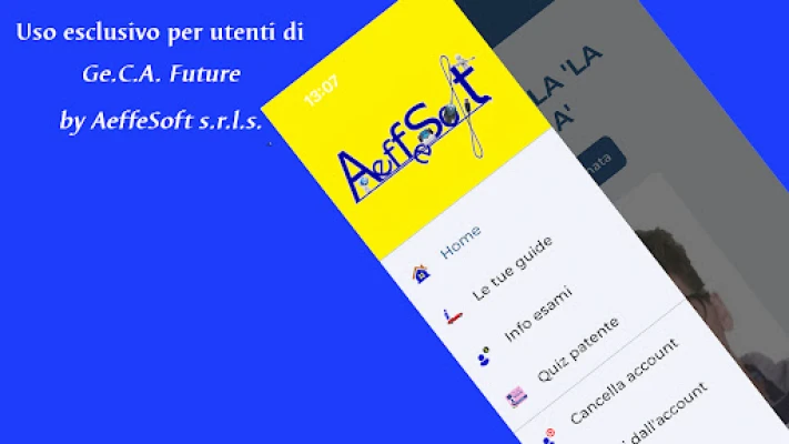 Scopri l'app dedicata ai candidati delle autoscuole che utilizzano il gestionale Ge.C.A. Future di AeffeSoft s.r.l.s. Accedi a risorse utili per patenti di ogni tipo, ADR, C.A.P. e C.Q.C., ottimizzando il tuo percorso formativo.
