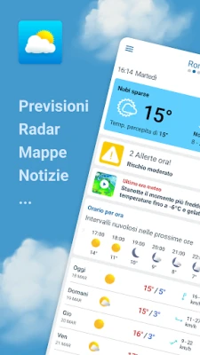 Addentrati in una previsione meteo senza precedenti, con dettagli fino a 14 giorni e analisi orarie approfondite. Ogni giorno si rivela con dati precisi su pressione atmosferica, temperatura percepita, direzione e velocità del vento, quota neve, umidità, orari di alba e tramonto, e persino le fasi lunari. Con un semplice gesto, potrai anche monitorare la qualità dell'aria e la concentrazione di polline nella tua zona, dati essenziali per il tuo benessere. Orientando il tuo dispositivo, scopri grafici intuitivi che tracciano l'andamento delle temperature, offrendoti una visione chiara e dinamica. L'esperienza si arricchisce ulteriormente con la mappa meteo animata, basata sul modello ECMWF e proiettata fino a 6 giorni. Esplora strati dedicati a precipitazioni, temperature, pressione atmosferica, temperatura del mare e qualità dell'aria per tenere sotto controllo ogni fenomeno meteorologico. Goditi inoltre un radar delle piogge in tempo reale e un tracciatore di uragani e tempeste, insieme ad animazioni satellitari NOAA (infrarossi e vapore acqueo) che mostrano l'evoluzione delle condizioni atmosferiche passate e presenti.